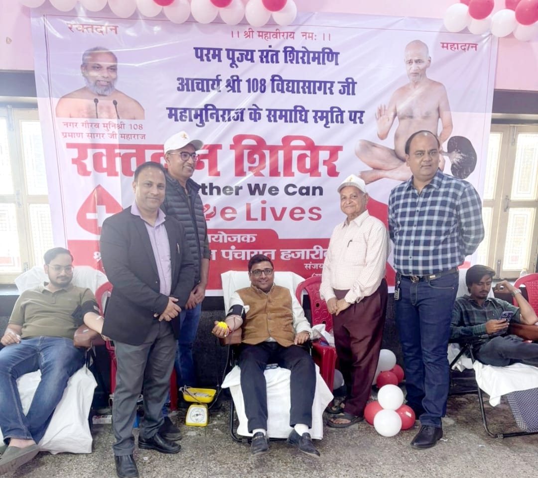हजारीबाग में रक्त की कमी दूर करने और थैलेसीमिया पीड़ितों को संबल देने में महत्वपूर्ण भूमिका निभाते हैं : हर्ष अजमेराआचार्य श्री 108 विद्यासागर जी महाराज की द्वितीय समाधि स्मृति पर रक्तदान शिविर उनके आदर्शों को सच्ची श्रद्धांजलि है : नागेंद्र विनायक रक्तदान महादान है, समाज के 43 लोगों ने मानवता की सेवा का प्रेरक उदाहरण प्रस्तुत किया है : संजय जैन अजमेरा हजारीबाग परम पूज्य संत शिरोमणि आचार्य श्री 108 विद्यासागर जी महामुनिराज की द्वितीय समाधि स्मृति के पावन अवसर पर श्री दिगम्बर जैन पंचायत के द्वारा जैन भवन परिसर में एक भव्य एवं सुव्यवस्थित रक्तदान शिविर का आयोजन किया गया। सेवा, समर्पण और श्रद्धा से ओत-प्रोत इस आयोजन में समाज के लोगों ने बढ़-चढ़कर भाग लिया और कुल 43 यूनिट रक्त संग्रहित किया गया। शिविर का शुभारंभ सुबह 11:00 बजे किया गया। रक्तदान की प्रक्रिया प्रारंभ हुई, जो दिनभर निरंतर चलती रही। शिविर में युवाओं के साथ-साथ वरिष्ठ नागरिकों एवं महिलाओं ने भी उत्साहपूर्वक रक्तदान कर समाज के सामने प्रेरणादायक उदाहरण प्रस्तुत किया। ब्लड संग्रह का कार्य आरोग्यम ब्लड बैंक की अनुभवी चिकित्सकीय टीम द्वारा पूरी सावधानी और आधुनिक उपकरणों के साथ संपन्न कराया गया। प्रत्येक रक्तदाता का पूर्व स्वास्थ्य परीक्षण किया गया तथा सुरक्षित प्रक्रिया के माध्यम से रक्त संग्रह सुनिश्चित किया गया। हजारीबाग में वर्तमान समय में रक्त की कमी को देखते हुए यह शिविर अत्यंत महत्वपूर्ण माना जा रहा है। विशेष रूप से थैलेसीमिया पीड़ित बच्चों, दुर्घटना पीड़ितों तथा गंभीर रोगों से जूझ रहे मरीजों के लिए यह रक्तदान शिविर जीवन दायी साबित होगा। कार्यक्रम के दौरान समाज के अध्यक्ष नागेंद्र विनायक, सचिव संजय जैन अजमेरा सहित समाज के कई गणमान्य सदस्य उपस्थित रहे। सभी ने आचार्य श्री विद्यासागर जी महाराज के तप, त्याग और समाज निर्माण में दिए गए योगदान को स्मरण करते हुए श्रद्धांजलि अर्पित की। वक्ताओं ने कहा कि आचार्य श्री का संपूर्ण जीवन मानव कल्याण, शिक्षा प्रसार और नैतिक मूल्यों की स्थापना के लिए समर्पित रहा है, और उनके आदर्शों पर चलते हुए समाज को निरंतर सेवा कार्यों में अग्रसर रहना चाहिए। शिविर के सफल संचालन में कार्यक्रम संयोजक हर्ष अजमेरा, अनीश लुहाड़िया एवं प्रतीक अजमेरा ने सक्रिय भूमिका निभाई। पंजीकरण व्यवस्था से लेकर रक्तदाताओं की सुविधा, अल्पाहार और प्रमाण पत्र वितरण तक की व्यवस्था सुव्यवस्थित ढंग से की गई।रक्तदान शिविर में रक्तदाताओं में सौरव जैन, हर्ष अजमेरा,रोबिन जैन, आर. के. शर्मा, निलेश जैन, ऋषभ जैन, सोहम राज, चेतन जैन, अनिश जैन, संयम जैन, सूर्यांश अजमेरा, सुनीत जैन, आदित्य जैन, सुबोध कुमार जैन, विवेक व
